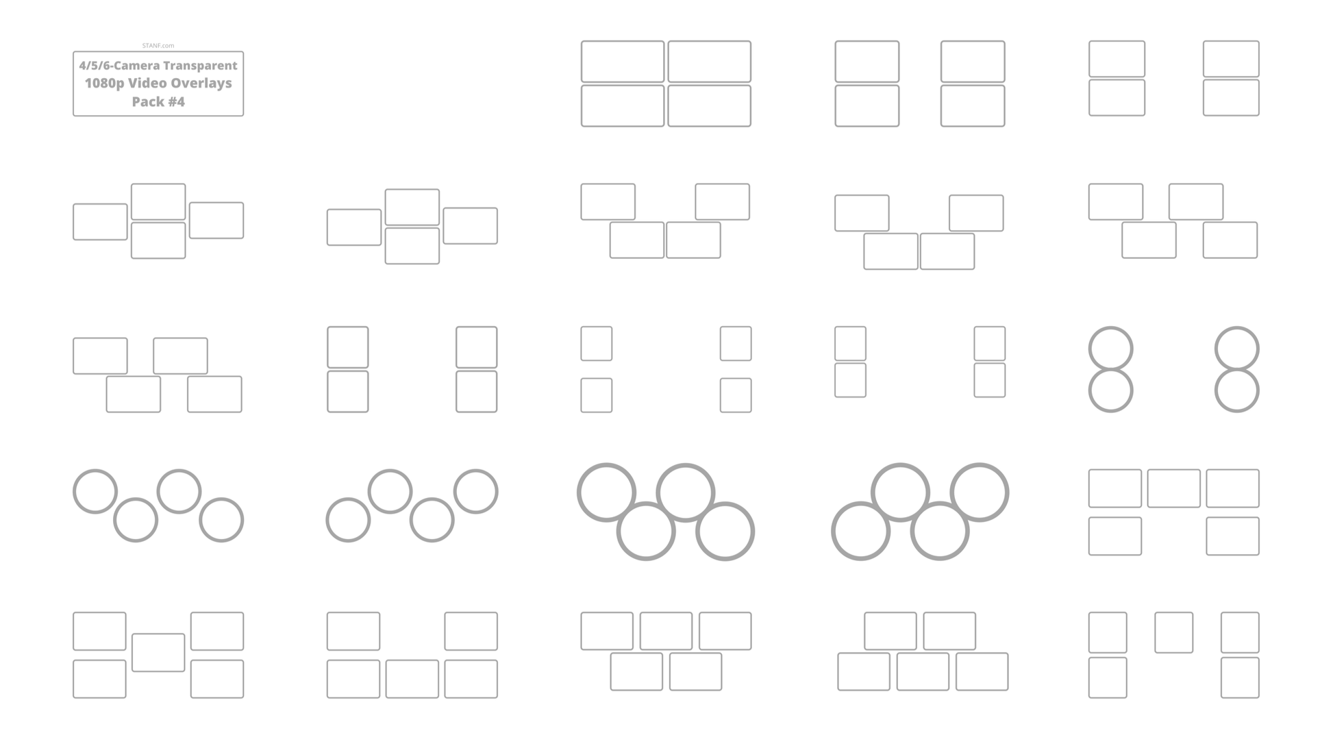 * 61 ready-made 1-Camera static PNG overlays, 71 ready-made 2-Camera static PNG overlays, 58 ready-made 3-Camera static PNG overlays , and 47 ready-made 4/5/6-Camera static PNG overlays.